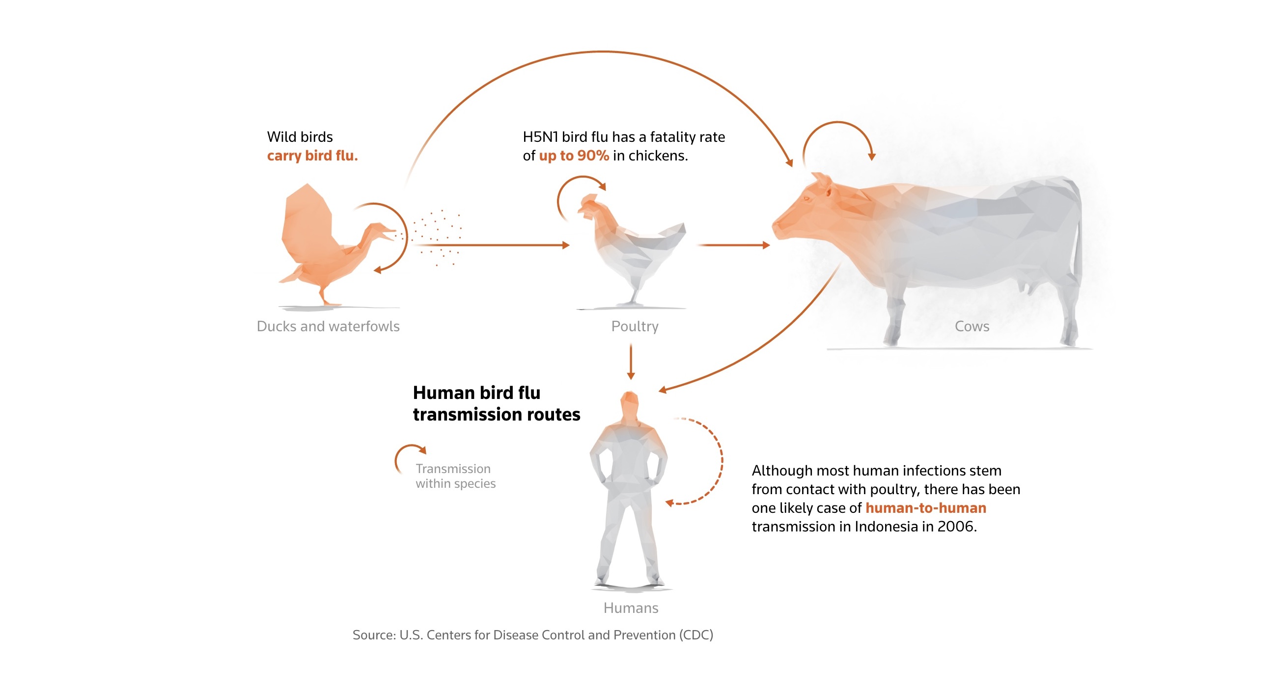 How humans can catch bird flu. The spread of bird flu to an increasing number of species and its widening geographic reach have raised the risks of humans being infected by the virus, according to the World Organisation for Animal Health (WOAH). / WOAHThe federal government incentivizes farms to test