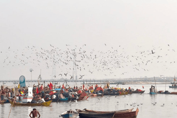 Boats and pilgrims crowd the riverbanks at the Maha Kumbh Mela, as a flock of birds takes flight overhead. / Raj Dave