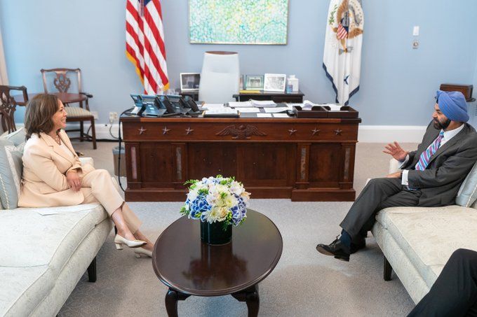 The newly appointed president of the World Bank, Ajay Banga met U.S. Vice President Kamala Harris at the White House togather US support for the World Bank’s mission to eliminate poverty, tackle the climate crisis, and promote shared prosperity. The meeting was the first official U.S. engagement since Banga took office, a White House release noted.