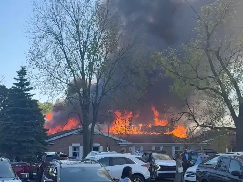 People gather at the site as smoke and fire rise, following an incident in which a man crashed his vehicle through the front doors of a Michigan church and opened fire with an assault rifle and set the church ablaze, in Grand Blanc, Michigan, U.S., September 28, 2025, in this screengrab obtained from social media video. / Heem Vaniawala/via REUTERS
