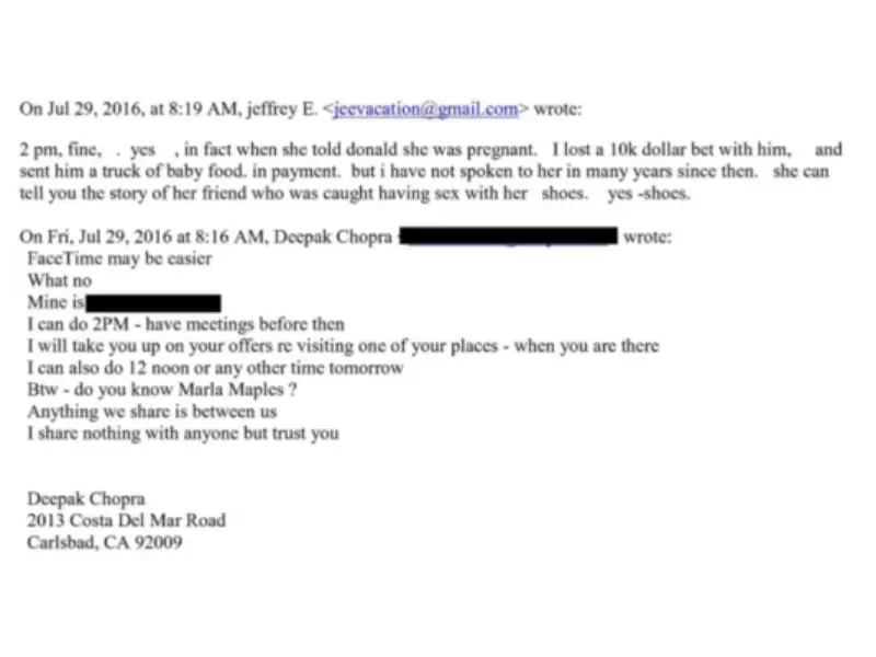Deepak Chopra in Epstein files / House Oversight Committee“Anything we share is between us,” Chopra wrote. “I share nothing with anyone but trust you.” Epstein replied with an anecdote about losing a bet to Trump during Maples’ pregnancy, saying he once “sent him a truck of baby food in payment.”