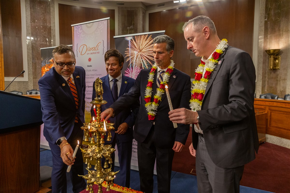 Representative Brian Fitzpatrick (PA-1) (right), Dan Meuser (PA-9) (center right), Representative Shri Thanedar (MI-13) (center left) and Asian American Hotel Owners Association President Bharat Patel (left) light the diya / BAPS