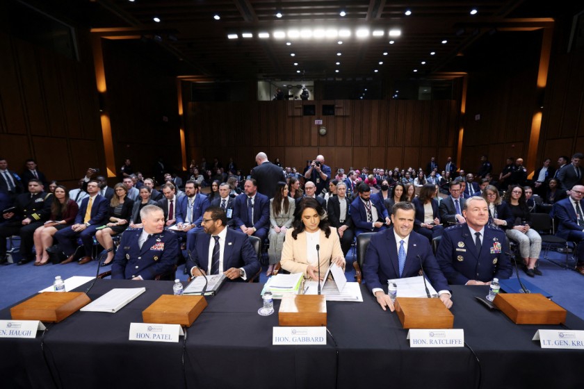Director of National Intelligence (DNI) Tulsi Gabbard, CIA Director John Ratcliffe, FBI Director Kash Patel, Air Force General and Director of the National Security Agency (NSA) Timothy Haugh and Air Force Lt. General and Director of the Defense Intelligence Agency (DIA) Jeffrey Kruse sit on the day they testify before a Senate Intelligence Committee hearing on worldwide threats, on Capitol Hill in Washington, D.C., U.S., March 25, 2025. REUTERS/Kevin Lamarque / Reuters