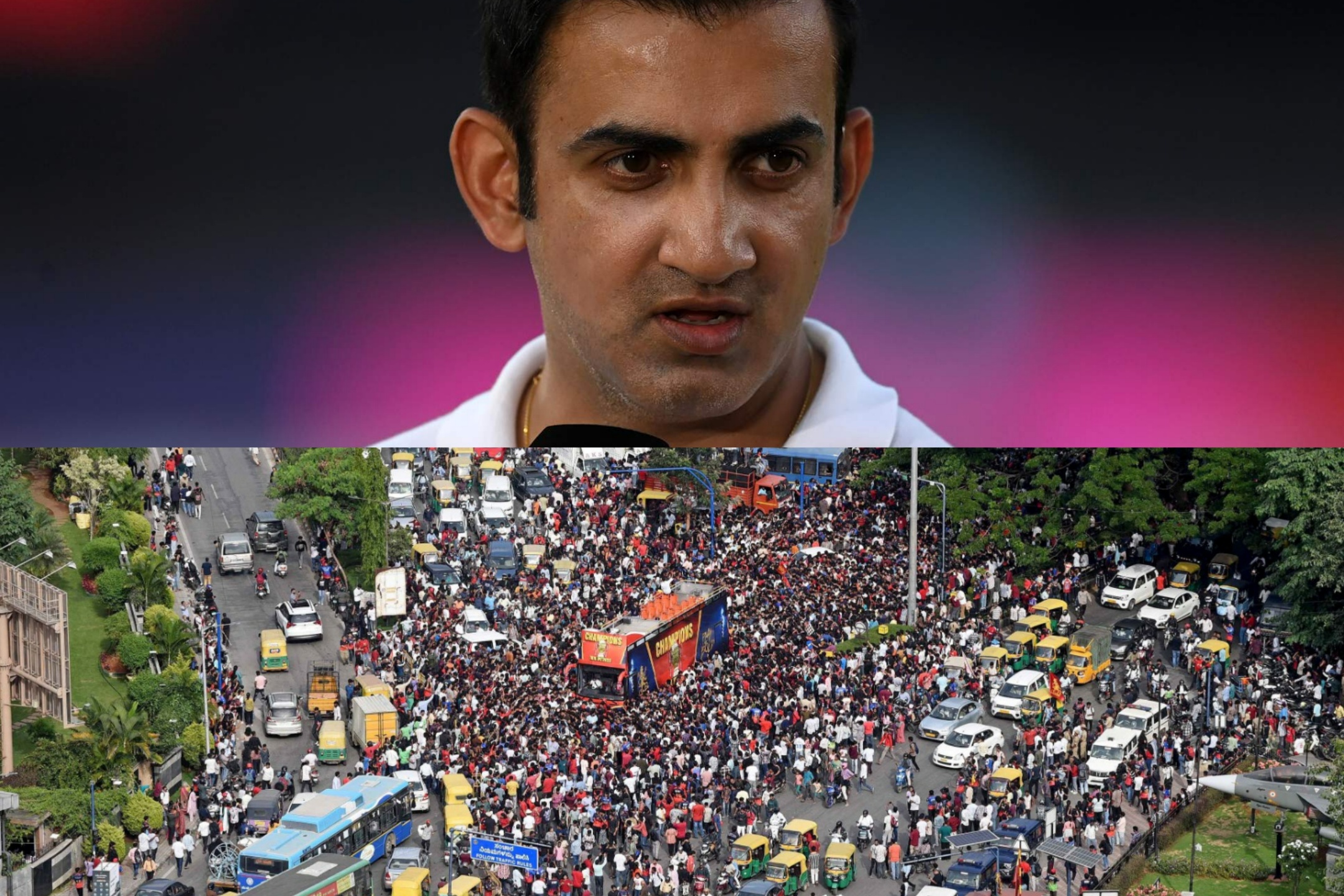 (Top) India coach Gambhir (Image- ICC); (Bottom) People gather to celebrate Royal Challengers Bengaluru's first Indian Premier League (IPL) title win, outside a cricket stadium in Bengaluru, India, June 4, 2025. / REUTERS/Stringer