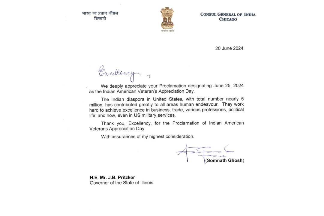 Consul General of India in Chicago Somnath Ghosh penned a letter of appreciation to Pritzker for recognizing Indian American veterans.