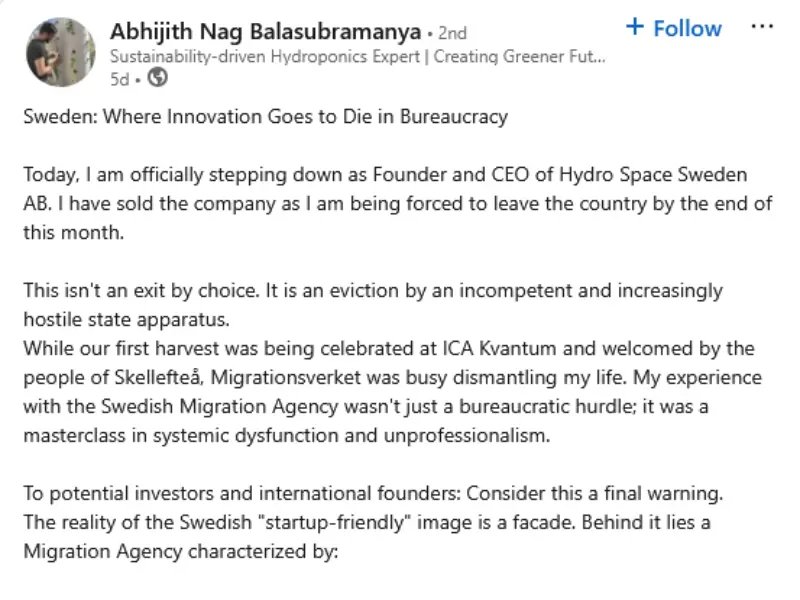 Abhijith Nag Balasubramanya, founder and CEO of Hydro Space Sweden AB, has announced his resignation from his role after being compelled to leave the country, accusing the Scandinavian nation’s immigration system of being “an incompetent and increasingly hostile state apparatus.”