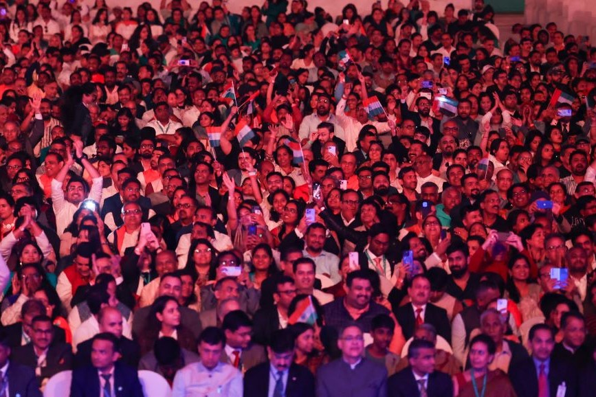 Gathering at the Ahlan Modi event in Abu Dhabi, UAE on February 13, 2024. PM addressing on the occasion. / PIB