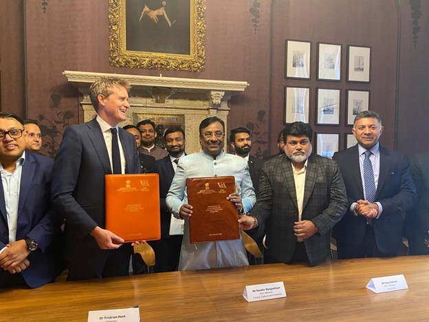 Credit: Tristam Hunt (left) and Sudhir Mungantiwar (right) holding the agreement folders. / Image: Twitter/@HCI_London
