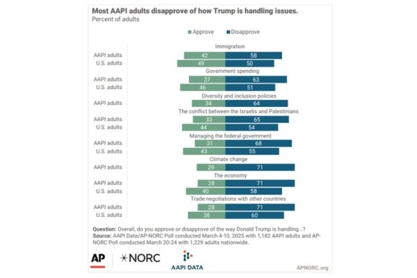 The latest AAPI Data/APNORC Poll released on April 9 shows widespread dissatisfaction among AAPI adults on the administration's handling of trade, the economy and management of government spending, with disapproval levels consistently outpacing those of the general public.