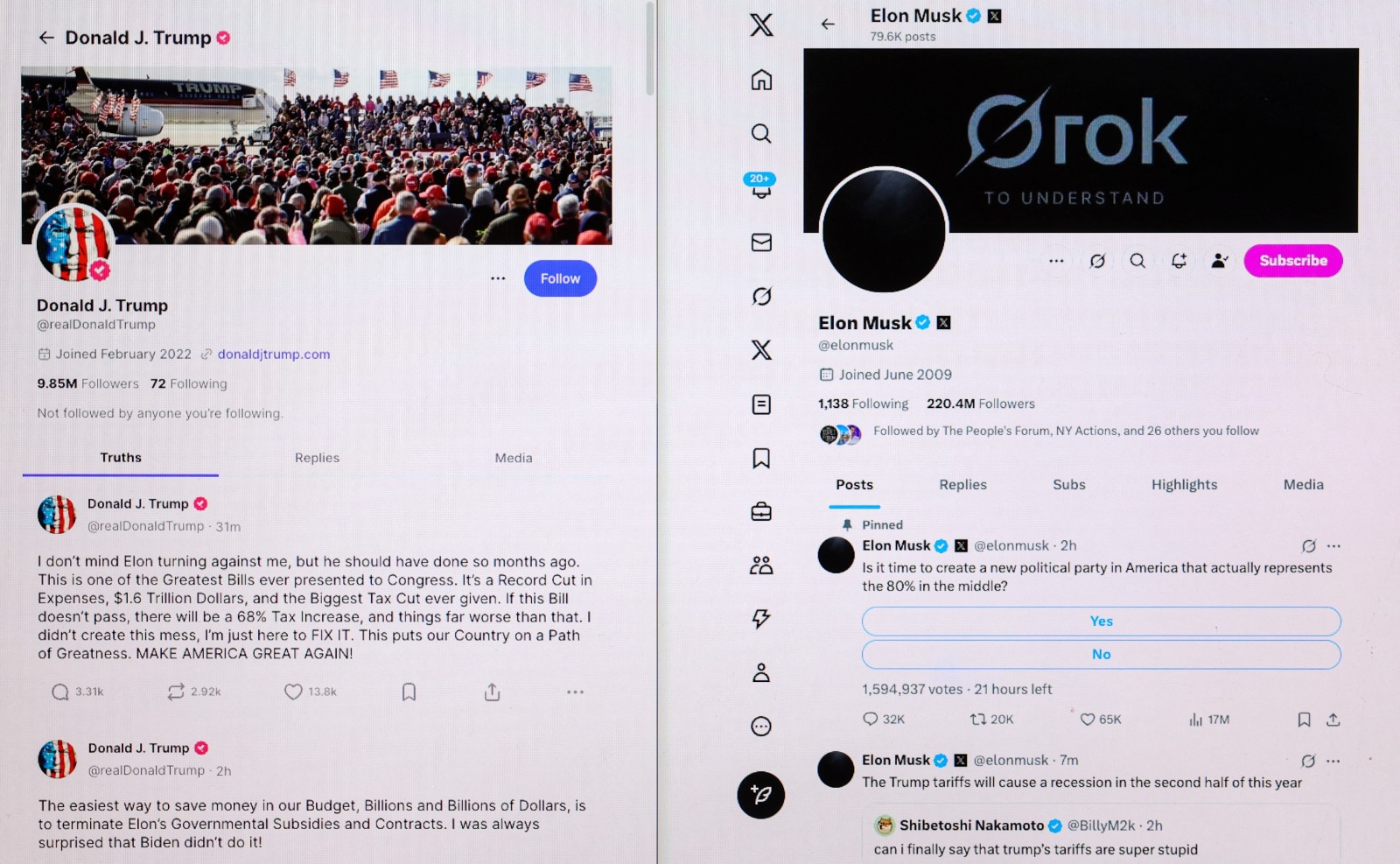 U.S. President Donald Trump's Truth Social account and Elon Musk's X account are seen side by side in this illustration photo taken in New York City, U.S., on June 5, 2025. / REUTERS/Brendan McDermid/Illustration