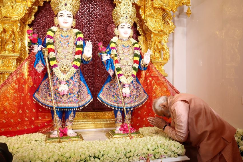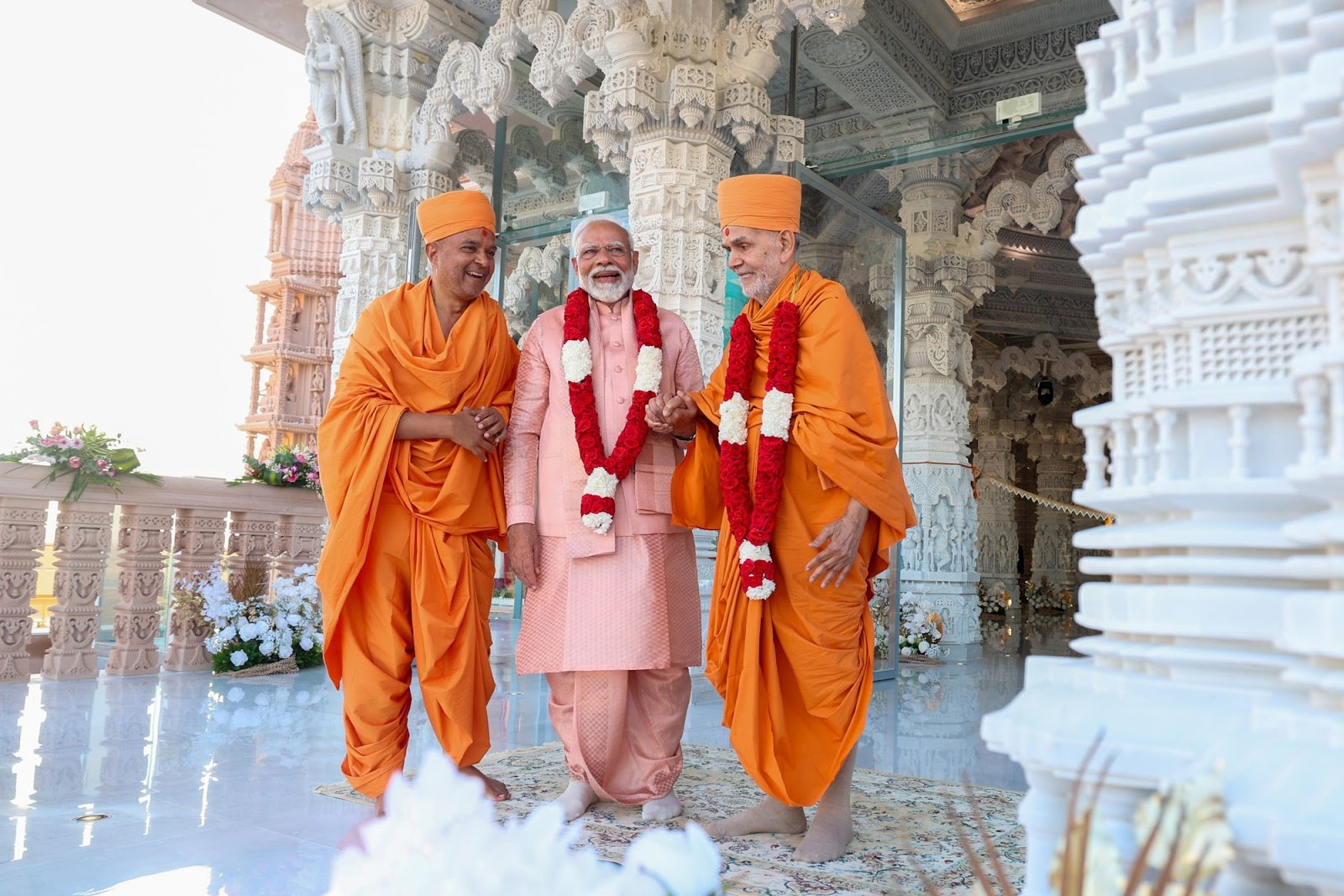 BAPS’ leader Mahant Swami Maharaj, Ishwarcharandas Swami, International Convenor of BAPS Swaminarayan Sanstha (BAPS) greeted the Prime Minister at the temple. / PIB