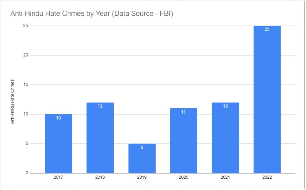 According to the FBI report released on October 16, 2023, there were 25 occurrences of anti-Hindu hate crimes. The number grew more than double in the year 2022 compared to the previous year.