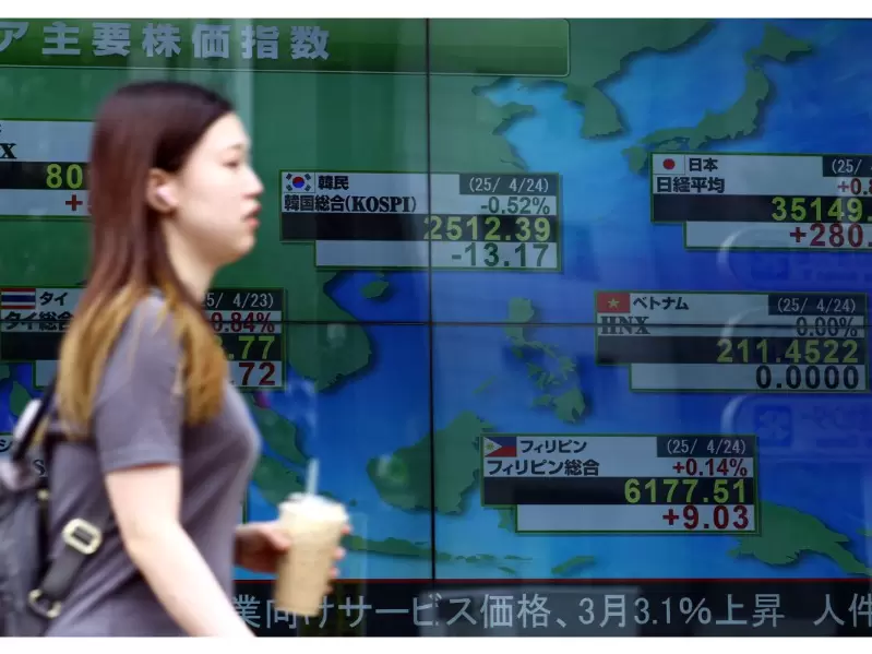 A woman walks past an electronic screen displaying the stock index prices of Asian countries outside a brokerage in Tokyo, Japan April 24, 2025. / REUTERS/Issei Kato/File Photo