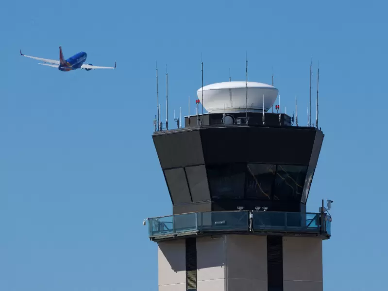 A commercial airliner takes off past the air traffic control tower at San Diego International Airport during the first day of a partial U.S. government shutdown in San Diego, California, U.S., October 1, 2025. / REUTERS/Mike Blake