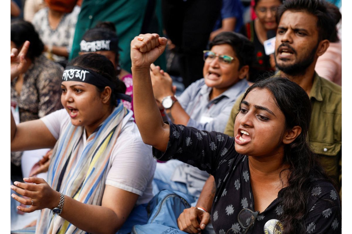 Medics sit and chant slogans as they attend a protest condemning the rape and murder of a trainee medic at a government-run hospital, in Kolkata, India, September 10, 2024. / Reuters/Sahiba Chawdhary