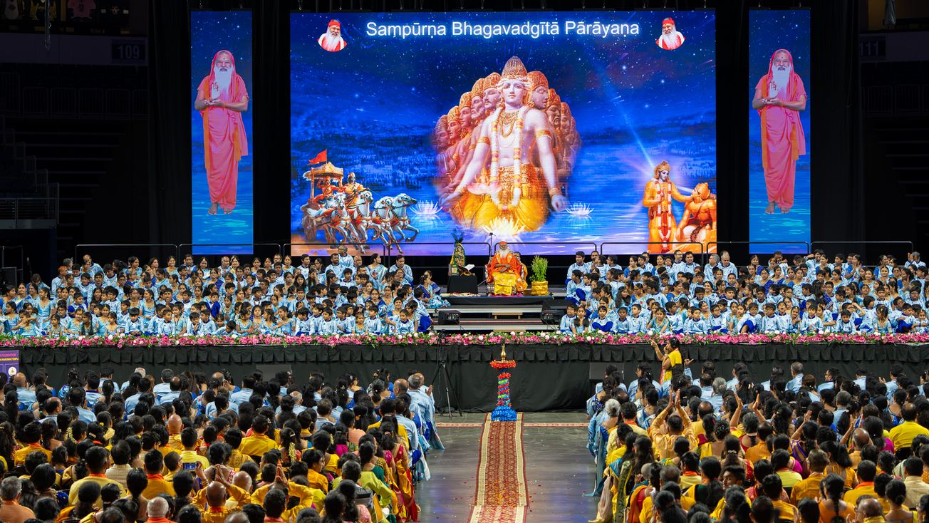 A huge crowd of 10,000 people gathered at the Allen East Center in Texas, USA to recite verses of the revered Hindu scripture, Bhagavad Gita. The event called the ‘SampÅ«rṇa Gita Parayana’ was organised by the SGS Gita Foundation and Karya Siddhi Hanuman Temple along with a musical meditation concert as part of Guru Purnima Mahotsav celebrations from Jun 29 - July 4, 2023.