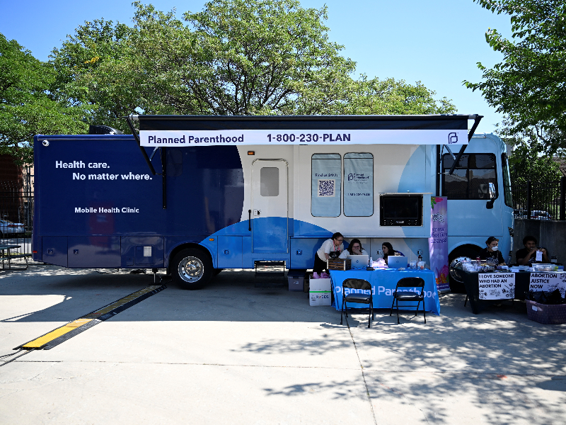 People check computers outside of a Planned Parenthood mobile clinic nearby the United Center in Chicago, Illinois, U.S. August 19, 2024 / REUTERS/Vincent Alban