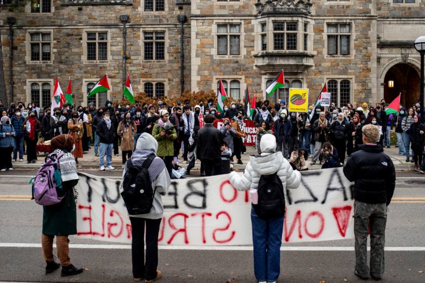 Students and other individuals gather with signs during a protest to express support for Palestinians in Gaza, amid the Israel-Hamas conflict, in front of the residence of the University of Michigan's president in Ann Arbor, Michigan, U.S. November 21, 2024. REUTERS/Emily Elconin/File Photo / Reuters