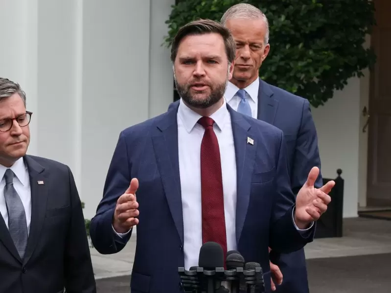 U.S. Vice President JD Vance speaks next to House Speaker Mike Johnson (R-LA) and Senate Majority Leader John Thune (R-SD) on the day U.S. President Donald Trump meets with top congressional leaders from both parties, just ahead of a September 30 deadline to fund the government and avoid a shutdown, at the White House in Washington, D.C., U.S., September 29, 2025. / REUTERS/Jonathan Ernst