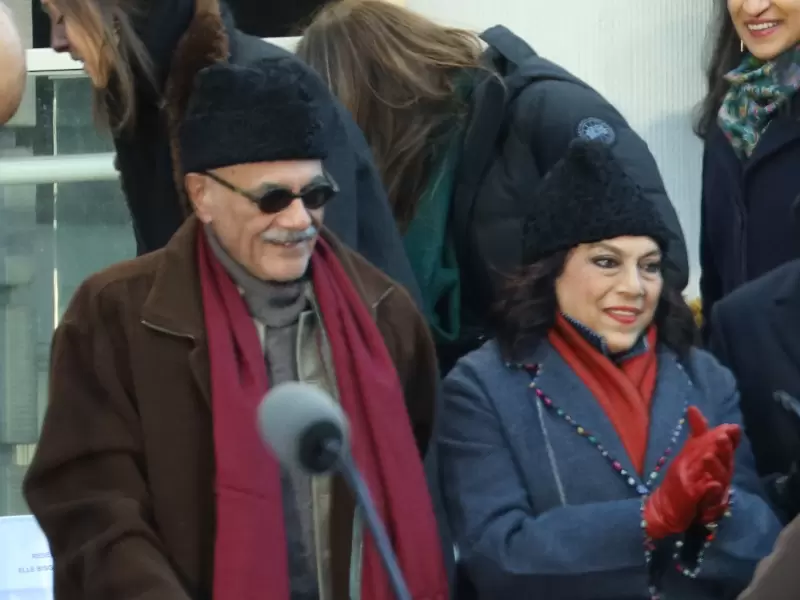 Mamdani on the steps of City Hall accompanied by his wife at the ceremony / Mohammed Jaffer Snapsindia