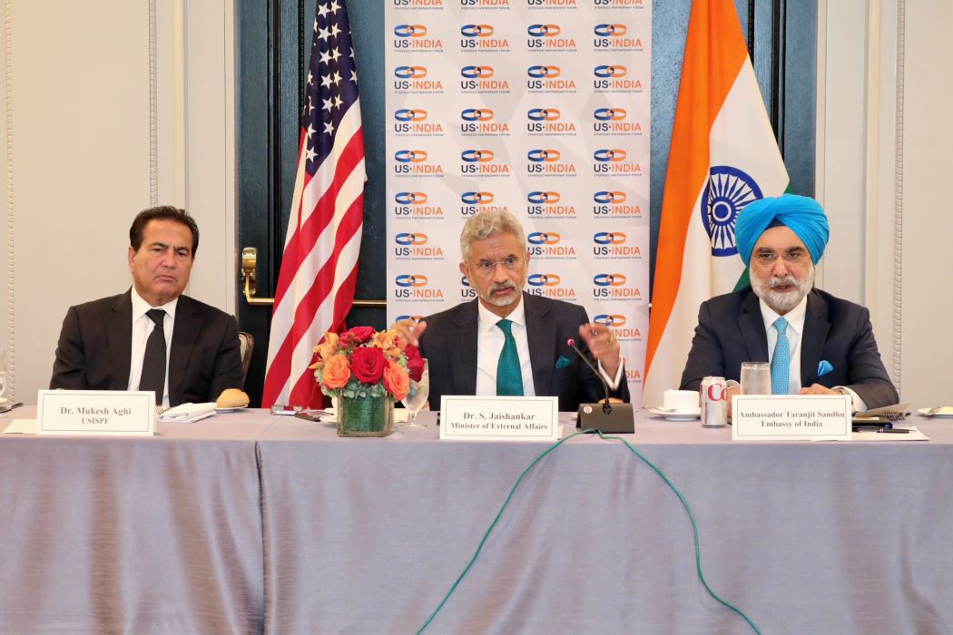 External Affairs Minister S Jaishankar addresses a luncheon alongside USISPF President Mukesh Aghi and Ambassador Taranjit singh Sandhu / X/@@USISPForum