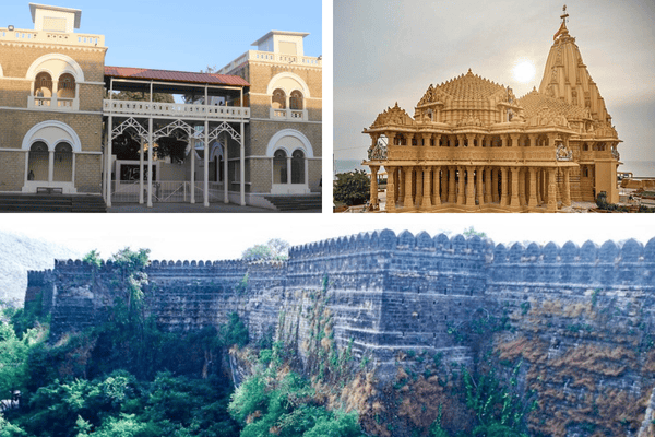 (top L) Mahatma Gandhi Museum, Rajkot, (Top R) Somanath Temple, Junagadh Fort wall. / Credit- MGM Rajkot, Wikipedia, Flickr
