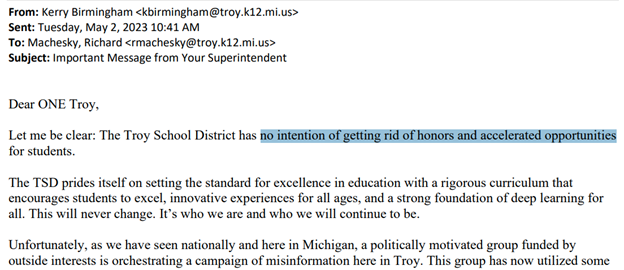 There was disturbing racism, harboured by the President of the school board. In May of 2023, Karl Schmidt, President, Troy Board of Education, wrote to several universities across the country that he had faced “resistance” from Chinese and Southern Asian parents. He generalized them as shallow and status seeking, suggesting that only want Honors classes for “bragging rights”. He further denigrated the community and students, by saying they only want to learn fast and not learn deep. This comes from a racist trope that Asians are good at memorizing, but not critical thinking or problem solving.