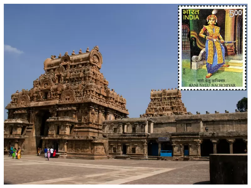 South Indian Temple and Velu Nachchiyar on a 2008 stamp of India. / Unsplash, Wikipedia