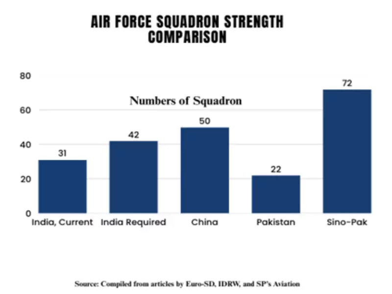 The deficiency of 11 squadrons translates to a shortage of approximately 200 aircraft. In contrast, China has over 50 squadrons, while Pakistan maintains 22 squadrons. In wartime scenarios, a higher number of squadrons means greater combat capabilities.