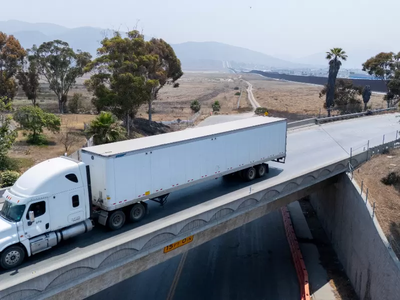 FILE PHOTO: A drone view shows a semi-truck from Tijuana, Mexico, as it makes its way across a bridge into the United States after clearing customs at the Otay Mesa border in San Diego, California, U.S. July 15, 2025. / REUTERS/Mike Blake/File Photo