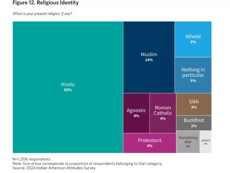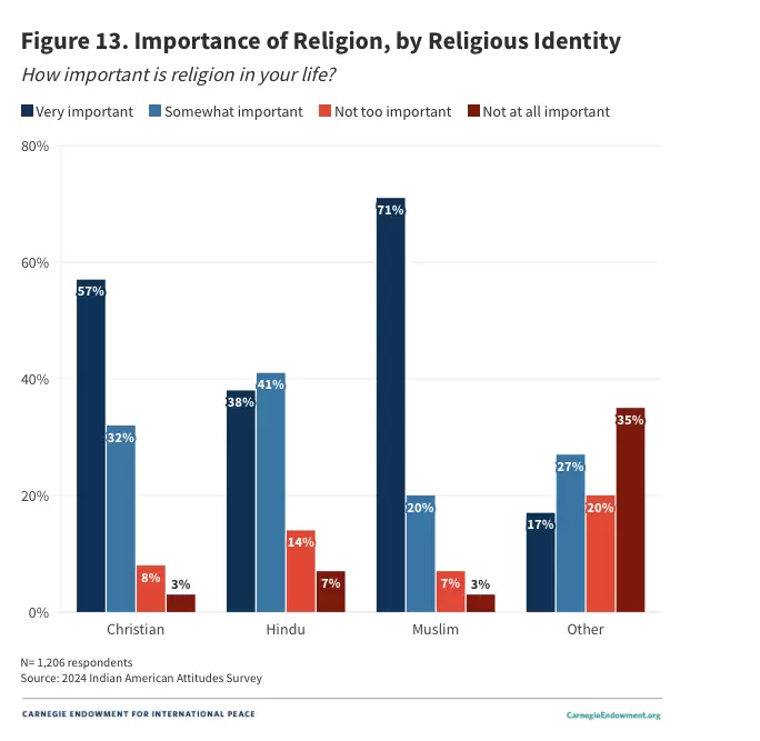 In understanding the data, one important takeaway is that only 55 percent of Indian American respondents in the survey identify as Hindu, compared to nearly 80 percent in India. So there needs to be caution in projecting the takeaways from this survey onto the Hindu community as whole, since “Indian American” is often treated in the public imagination—and in policymaking—as synonymous with “Hindu American.”