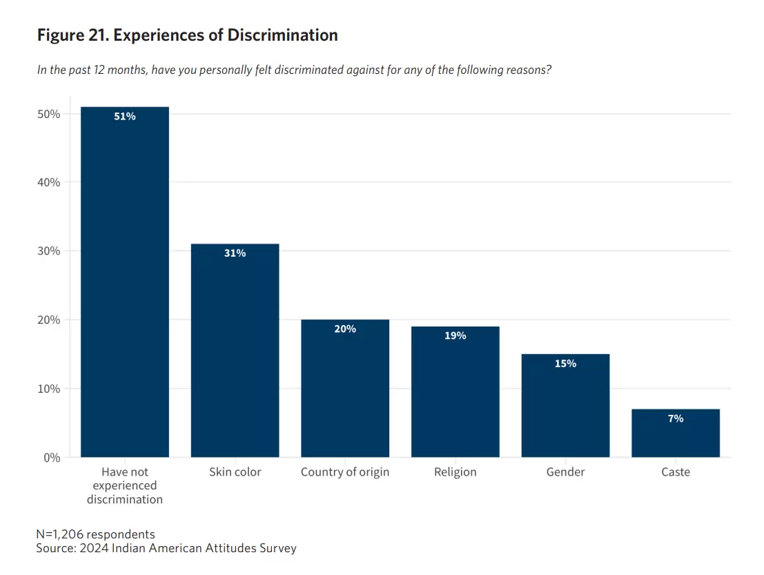 One of the most striking findings in the survey is that only seven percent of Indian Americans reported caste discrimination in the past year. By contrast, far higher shares reported discrimination on the basis of skin color (31 percent), country of origin (20 percent), or religion (19 percent). This confirms what CoHNA and other Hindu advocacy groups have consistently said: caste discrimination is not a widespread reality in the U.S., and existing anti-discrimination laws are more than sufficient to address any incidents that do occur.