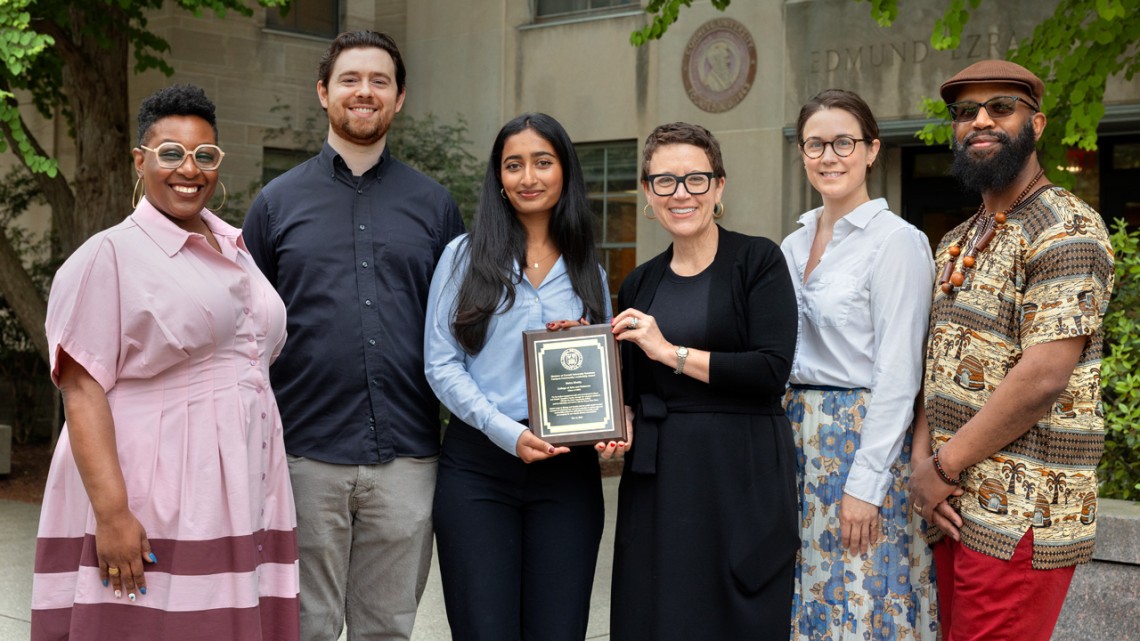 Campus Community Leadership Award winner Netra Shetty ’25 (center-left) poses with (from left) Marla Love, the Robert W. and Elizabeth C. Staley Dean of Students; Alec Brown, program manager of the Hunter R. Rawlings III Cornell Presidential Research Scholars Program; Monica Yant Kinney, interim vice president for university relations; Sarah Bartlett, volunteer and outreach manager at the Ithaca Free Clinic; and Taili Mugambee, lead program coordinator of Ultimate Reentry Opportunity, outside of / Ryan Young / Cornell University