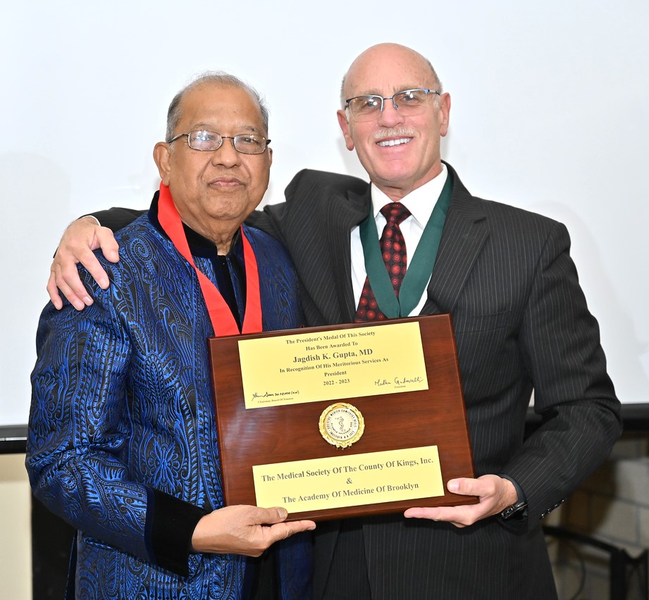 Dr. Jagdish K. Gupta was awarded the President Gold Medal by the Medical Society of the County of Kings (MSCK), Brooklyn's oldest scientific organization, and thus made a member of its elite president club. The award was presented at the County Society's 174th president's dinner at Dyker Beach Golf Club, as part of its bicentennial year celebrations. His wife, Meena Gupta, was presented with the Golden Charm as the 174th First Lady.
