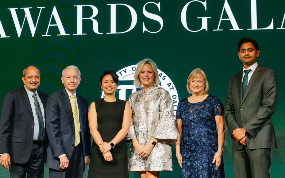 Honorees at the 2025 UT Dallas Awards Gala include (from left) V. Paddy Padmanabhan MS’87, PhD’90; Charles D. Davidson MS’80; Fern Yoon BS’07, MS’08; Jae Lynn Akin, human resources and development executive at State Farm; Shelly Fust Schofield MS’79; and Raghu Yarlagadda MS’07. / UT Dallas