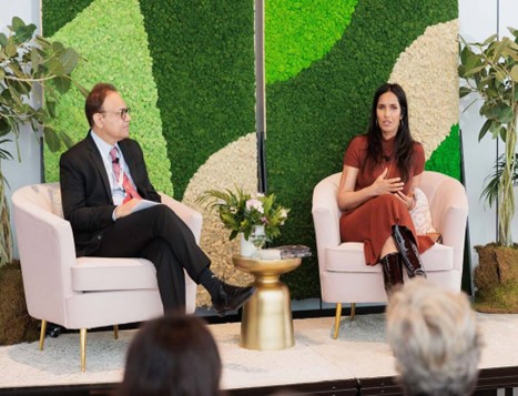 Arun Upneja (left), dean of the School of Hospitality Administration, interviewed Top Chef star Padma Lakshmi on stage and gave her the school’s 2024 ICON Award during SHA’s annual Hospitality Leadership Summit / (Boston University)