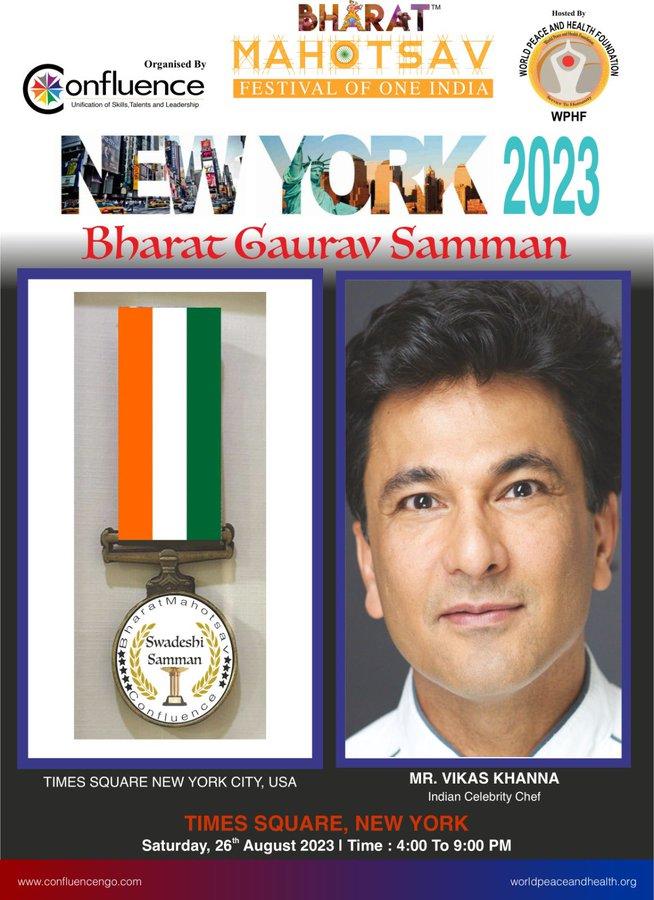 Vikas Khanna, an Indian American celebrity chef, was awarded the Swadeshi Samman, also known as the Bharat Gaurav Samman, at the 'Bharat Mahotsav' in New York for his contributions to the people, the community, and his achievements.