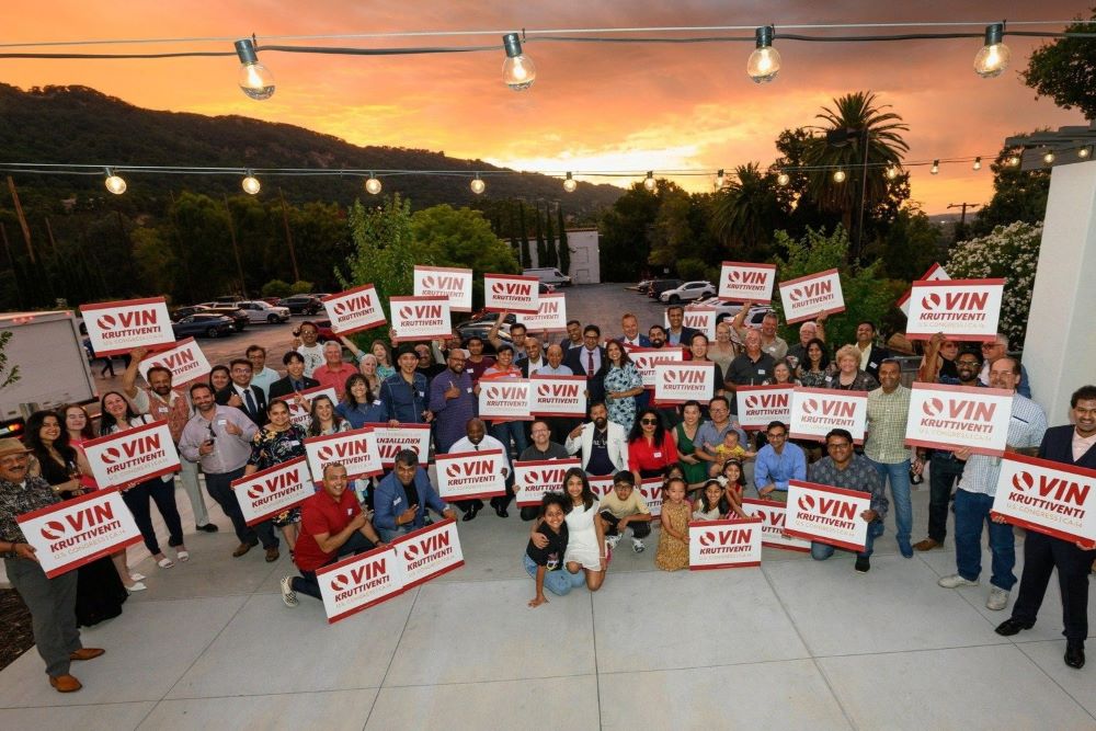 Supporters of Vinay 'Vin' Kruttiventi, are shown with the businessman turned politician (center) who is challenging Rep. Eric Swalwell for California's 14th Congressional District seat / X/Twitter