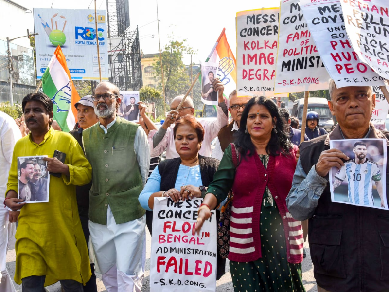 Congress activists along with football lovers hold a protest near the Gostopal Statue condemning alleged mismanagement during Lionel Messi’s GOAT India Tour in the city, demanding accountability and refunds for disappointed fans after chaos at the Salt Lake Stadium, Monday, December 15, 2025. / IANS