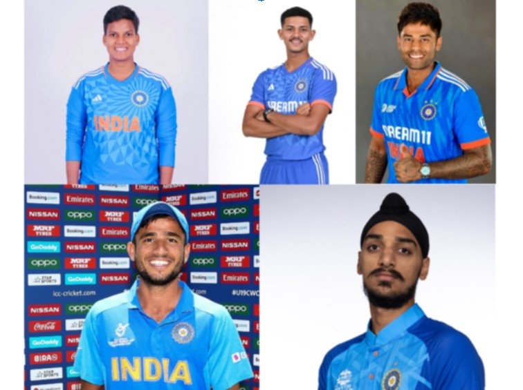 Deepti Sharma (top left), Yashasvi Jaiswal (top center), Suryakumar Yadav (top right), Ravi Bishnoi (bottom left), and Arshdeep Singh / (bottom right) / X - @Deepti_Sharma06 @ybj_19 @surya_14kumar @RaviBishnoiCri1 @arshdeepsinghh