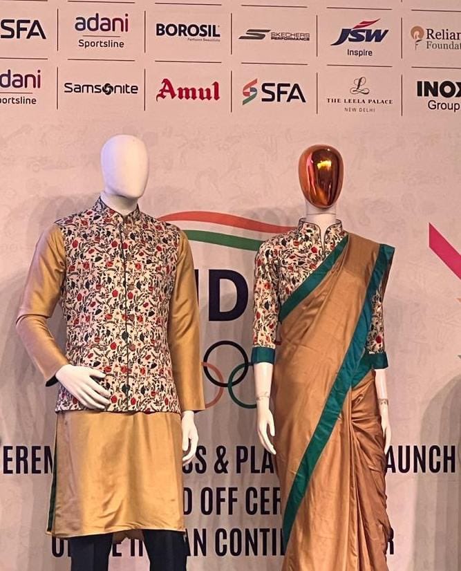 The athletes’ ceremonial attire features a khaki textured saree for women and a khaki kurta for men, both of which were designed by the National Institute of Fashion Technology (NIFT).The garments, which are made from recycled fabrics and feature Indian prints and patterns, aim to promote sustainability while also showcasing India's rich cultural heritage.