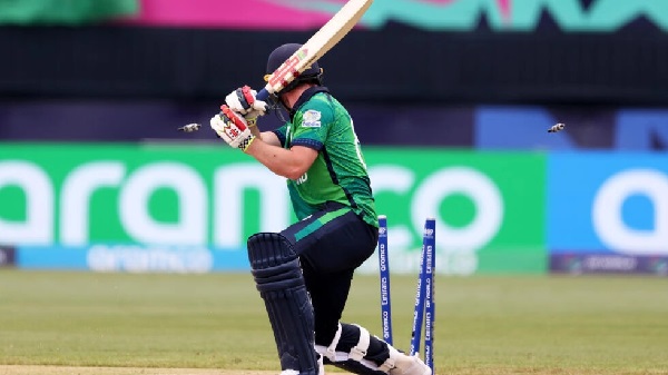 Josh Little of Ireland is bowled by India's Jasprit Bumrah during the June.5 match in the T20 World Cup. / Robert Cianflone/GETTY IMAGES NORTH AMERICA/AFP