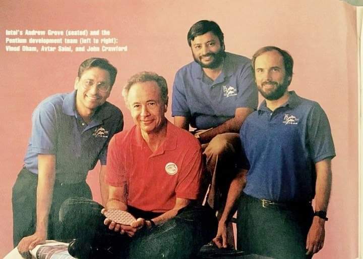 Photo courtesy LinkedIn/ Dr Satya Gupta / The core team behind the Pentium Processor: Intel's then CEO Andy Grove with Vinod Dham, Avtar Saini and John Crawford. Saini was largely responsible for taking the Pentium to production and was then closely involved in Intel’s transition to 64 bit processors as General Manager of the Santa Clara Microprocessor Division.