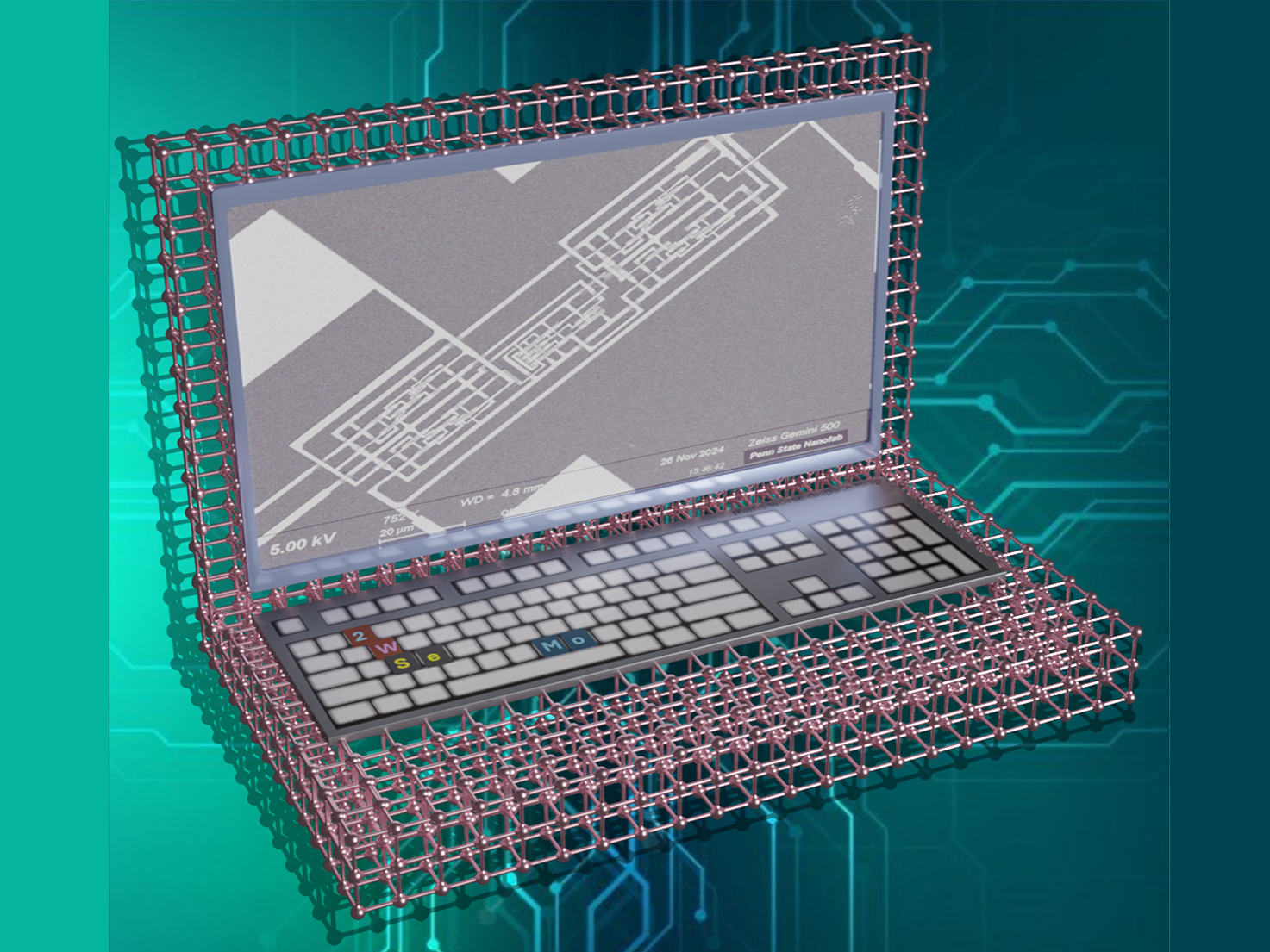 This conceptual illustration of a computer based on 2D molecules displays an actual scanning electron microscope image of the computer fabricated by a team by researchers at Penn State. The keyboard features highlighted keys labeled with the abbreviations for molybdenum disulfide and tungsten diselenide, representing the two 2D materials used to develop the transistors in the computer. / Credit: Krishnendu Mukhopadhyay/Penn State.