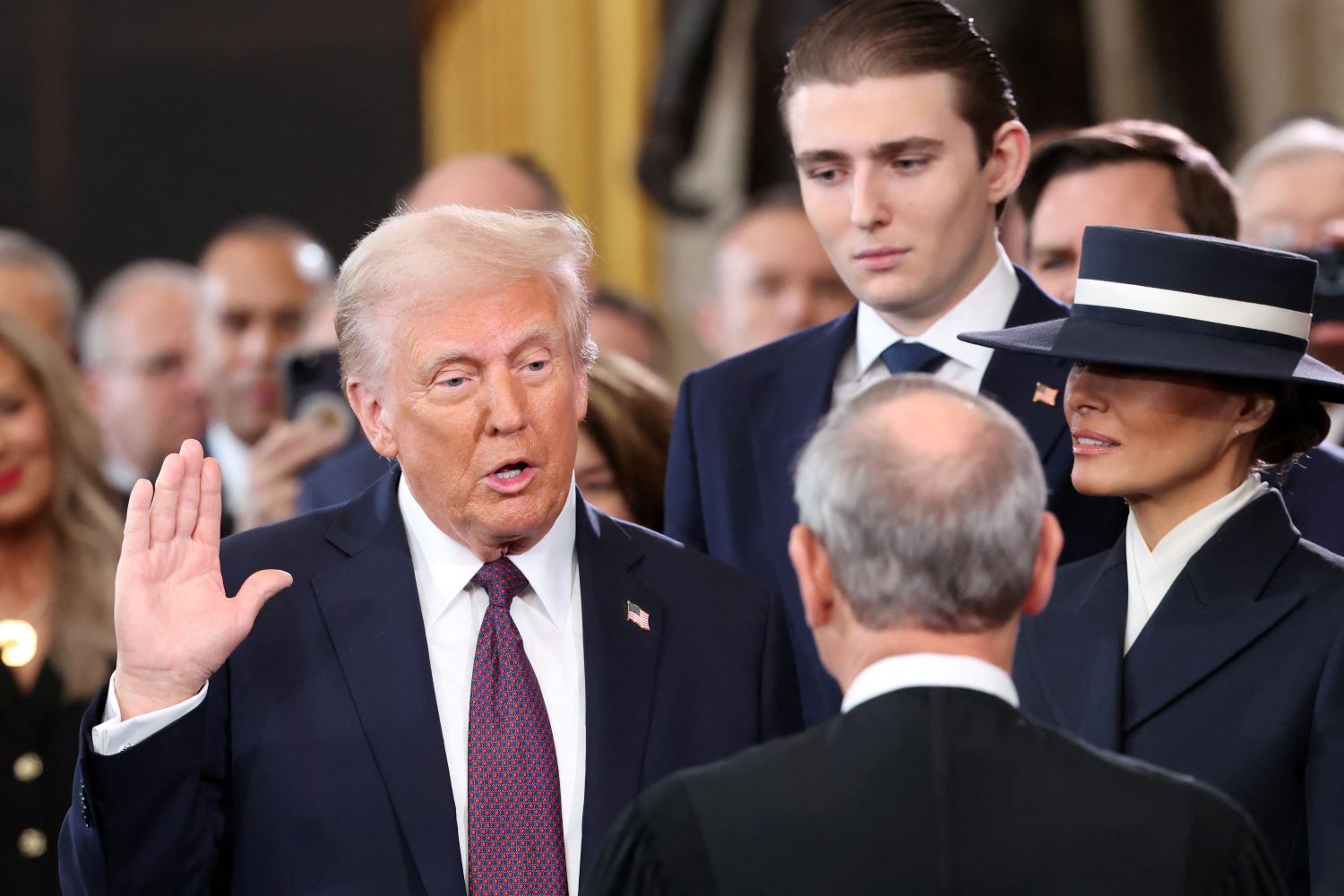 U.S. President Donald Trump takes oath as Barron Trump and Melania Trump look on the day of his Presidential Inauguration at the Rotunda of the U.S. Capitol in Washington, U.S., January 20, 2025. / REUTERS/Kevin Lamarque/Pool