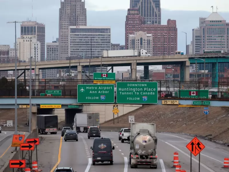 Commercial trucks can be seen in the lane towards the Ambassador Bridge to Windsor, Ontario, in Detroit, Michigan, U.S., February 1, 2025. / REUTERS/Rebecca Cook/File Photo