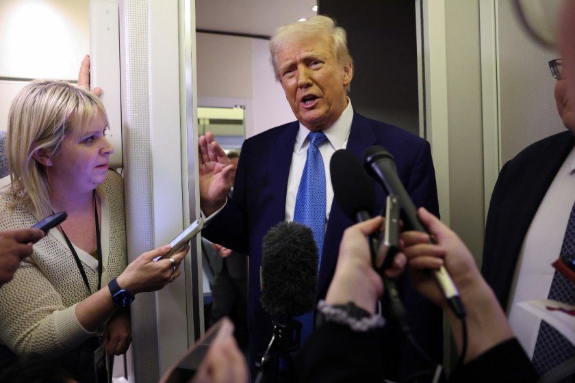 U.S. President Donald Trump speaks to reporters aboard Air Force One on his return to Washington, U.S., February 19, 2025. REUTERS/Kevin Lamarque / Reuters