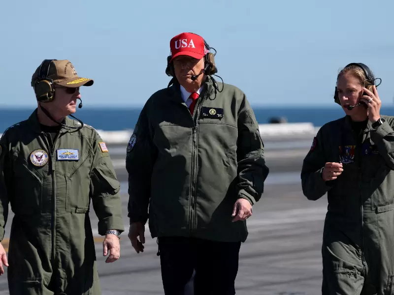 U.S. President Donald Trump walks with Chief of Naval Operations Admiral Daryl Caudle, aboard the aircraft carrier USS George H.W. Bush off the coast of Norfolk, Virginia, U.S. October 5, 2025. / REUTERS/Jonathan Ernst REFILE - CORRECTING FROM "U.S. ARMY" TO "CHIEF OF NAVAL OPERATIONS ADMIRAL DARYL CAUDLE".
