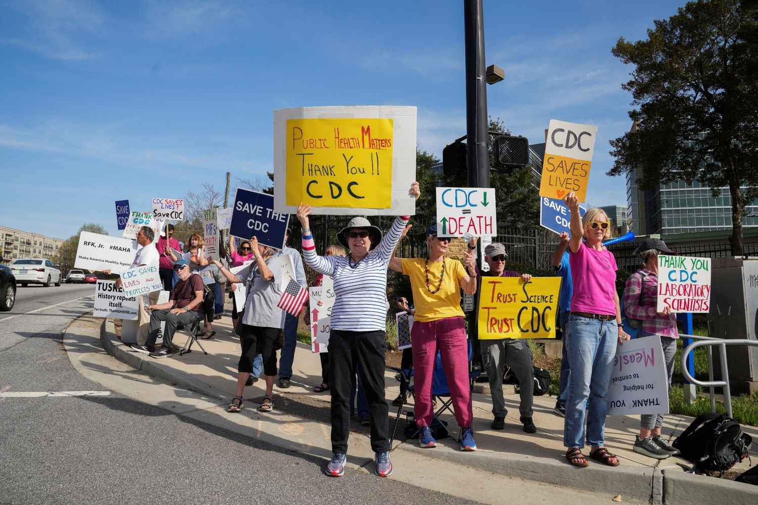 FILE PHOTO: Demonstrators protest outside the Center for Disease Control, in Atlanta, after the Trump administration began mass layoffs of 10,000 staffers at U.S. health agencies under the Department of Health and Human Services, including the FDA, CDC and the National Institutes of Health, in Atlanta, Georgia, U.S. April 1, 2025. / REUTERS/Megan Varner/File Photo