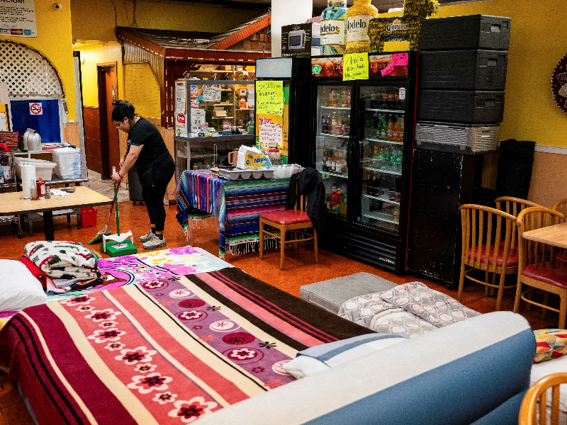 A woman sweeps the floor next to an air mattress and makeshift beds inside the restaurant owned by their family, who say they are staying there to protect themselves from potentially being profiled by federal agents while traveling between home and work, amid reports that the U.S. Department of Homeland Security is planning to deploy federal border agents to Louisiana in the coming days, in New Orleans, Louisiana, U.S., December 2, 2025. / REUTERS/Seth Herald